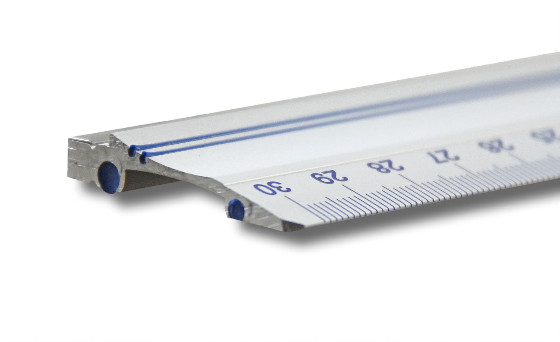 With a straight, high-grade stainless steel cutting edge to prevent scraping of the ruler during cutting. The rubber strips inserted in the aluminum body ensure a secure and non-slip grip on the workpiece..