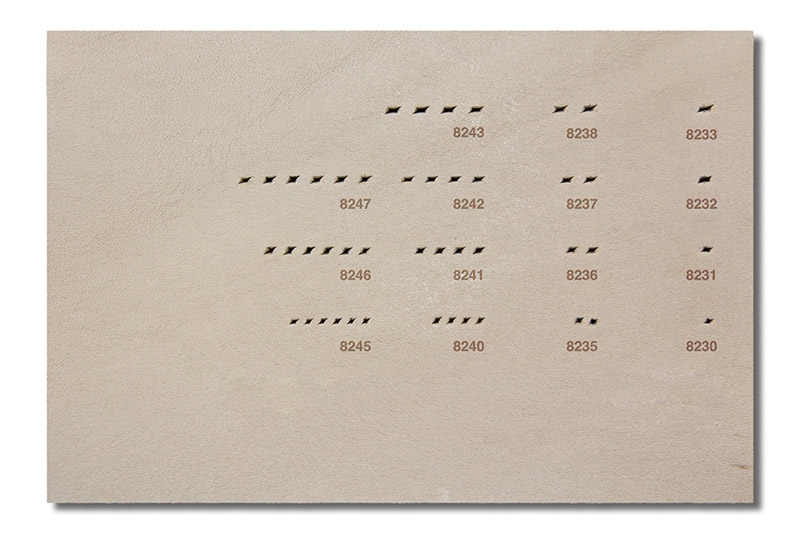 - One prong (3.0 mm (8 SPI)) max. 8 mm leather thickness- Two prongs (3.0 mm (8 SPI)) (2,2 mm distance prong - prong) - (3,0 mm seam distance center - center) - max. 8 mm leather thickness- Three prongs (3.0 mm (8 SPI)) (2,2 mm distance prong - prong) - (3,0 mm seam distance center - center) - max. 8 mm leather thickness- Four prongs (3.0 mm (8 SPI)) (2,2 mm distance prong - prong) - (3,0 mm seam distance center - center) - max. 8 mm leather thickness- Six prongs (3.0 mm (8 SPI)) (2,2 mm distance prong - prong) - (3,0 mm seam distance center - center) - max. 8 mm leather thickness- Ten prongs (3.0 mm (8 SPI)) (2,2 mm distance prong - prong) - (3,0 mm seam distance center - center) - max. 8 mm leather thickness