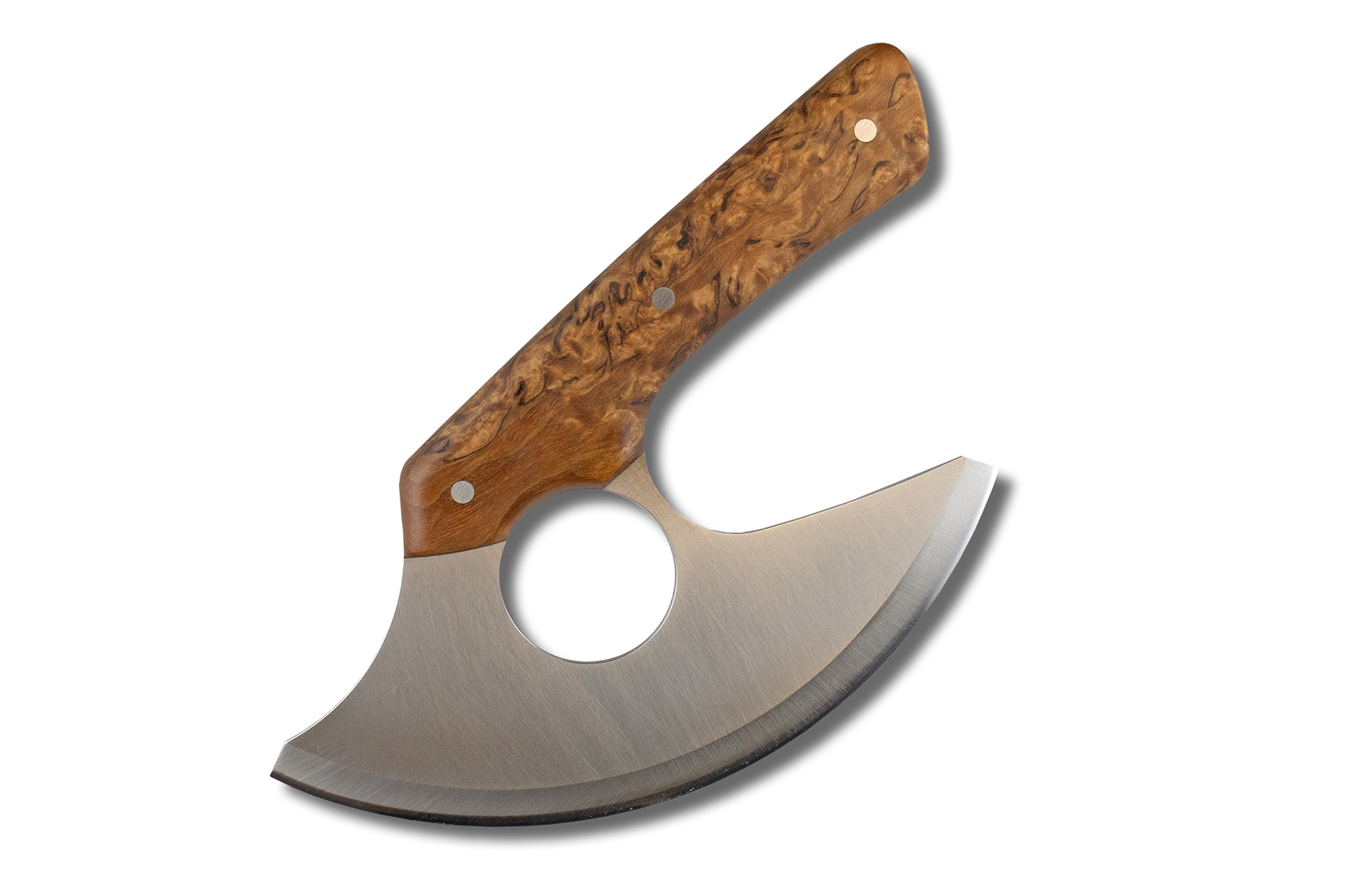 it is best suited for long straight cuts in heavy learther.Features:stainless Sandvik - bladesteel 14C28NHardness ca. 60°HRC for longlasting sharpnessBladeradius: 100 mmBladethickness: 2,0 mmBladewidth: 145 mmHandlelength: 120 mmHandlethickness: 15 mmWeight: 150 gHandlematerial: spalted and stabilized maple, black fibre layerCaution it is sharp and may shave! Natural wood might differ in grainpattern and colour.For longlasting cuttingedges we recommend the use of a plastic cuttingboard. If you want to learn how to sharpen Roundknifes, visit one of our sharpening workshops.