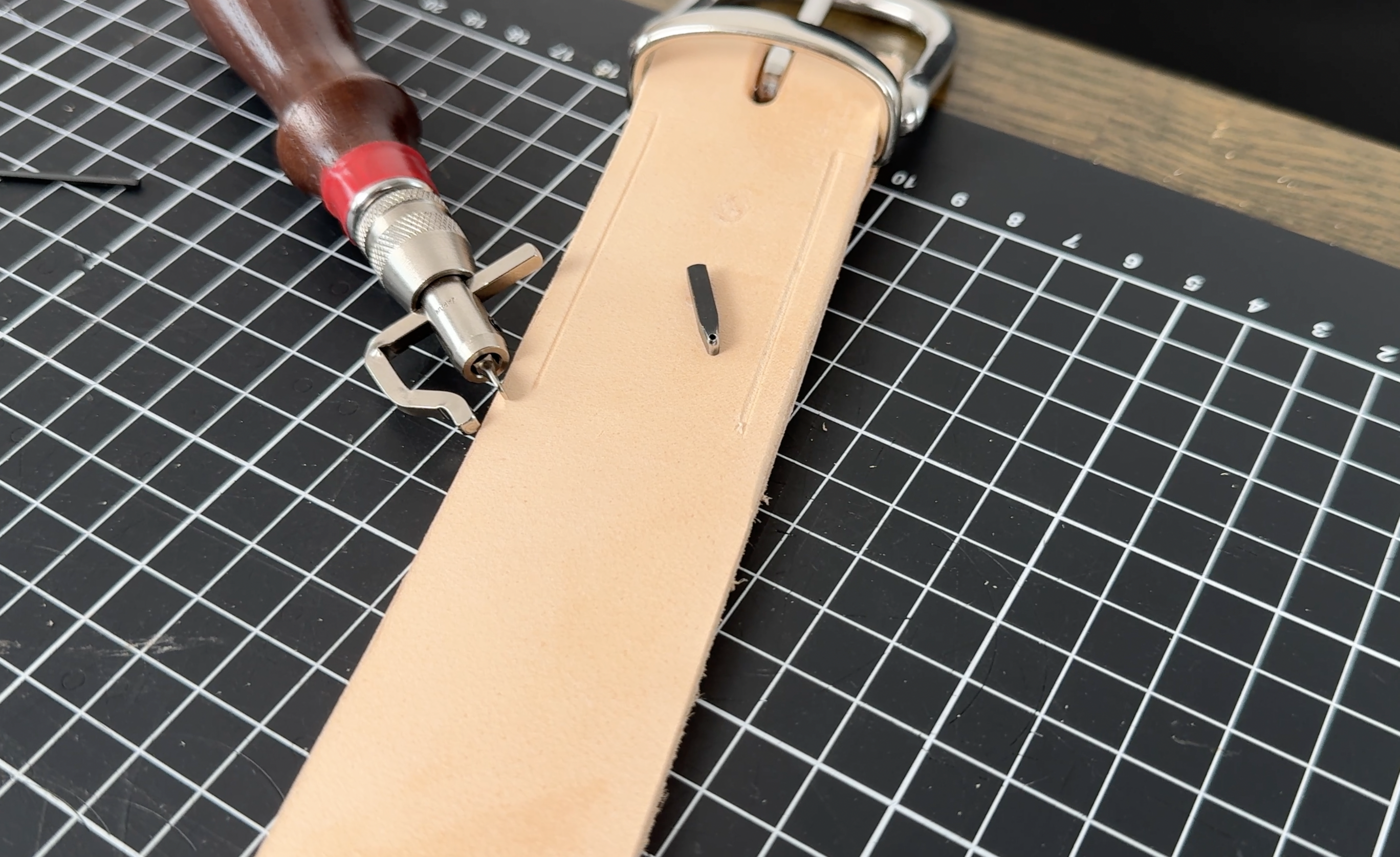 Das Langloch für den Dorn der Schließe entsteht indem zwei benachbarte Löcher mit dem Schlitzeisen verbunden werden.