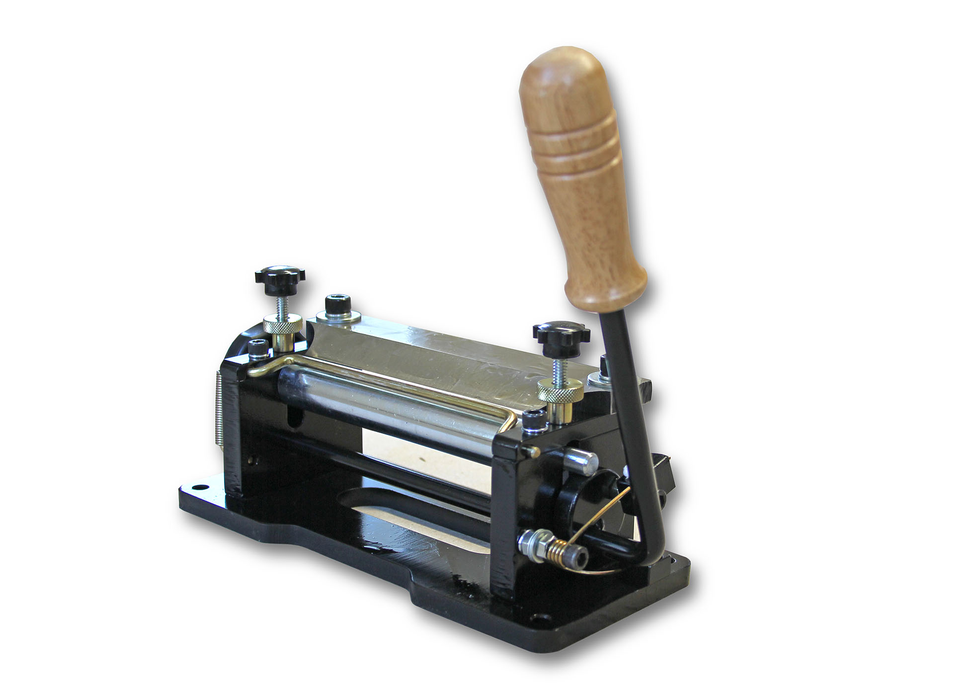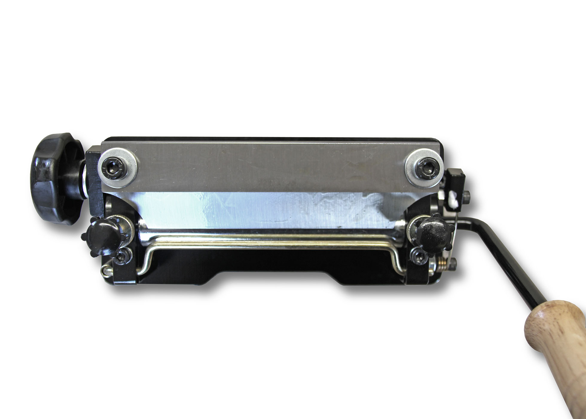 To ensure that the machine is secure, we recommend to affix it on your workbench with 4 screws (not included). The thickness to be split can be set with the thumbscrew on the top right and left. With the wooden handle, the roll is raised until the depth to be split is reached. The large adjusting screw on the left fixes the roller.