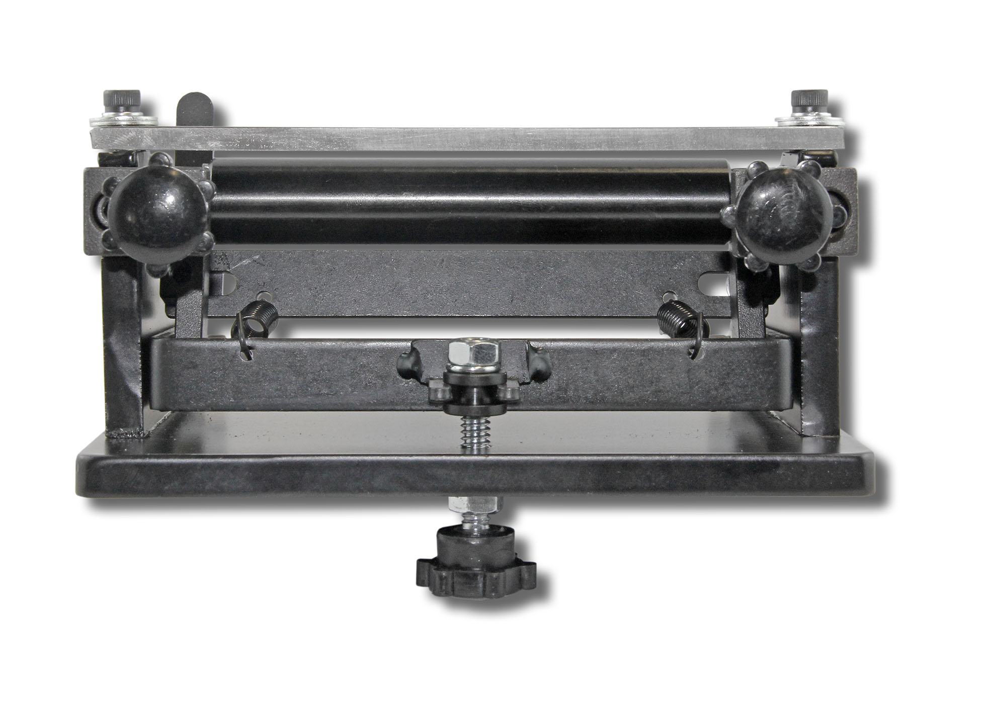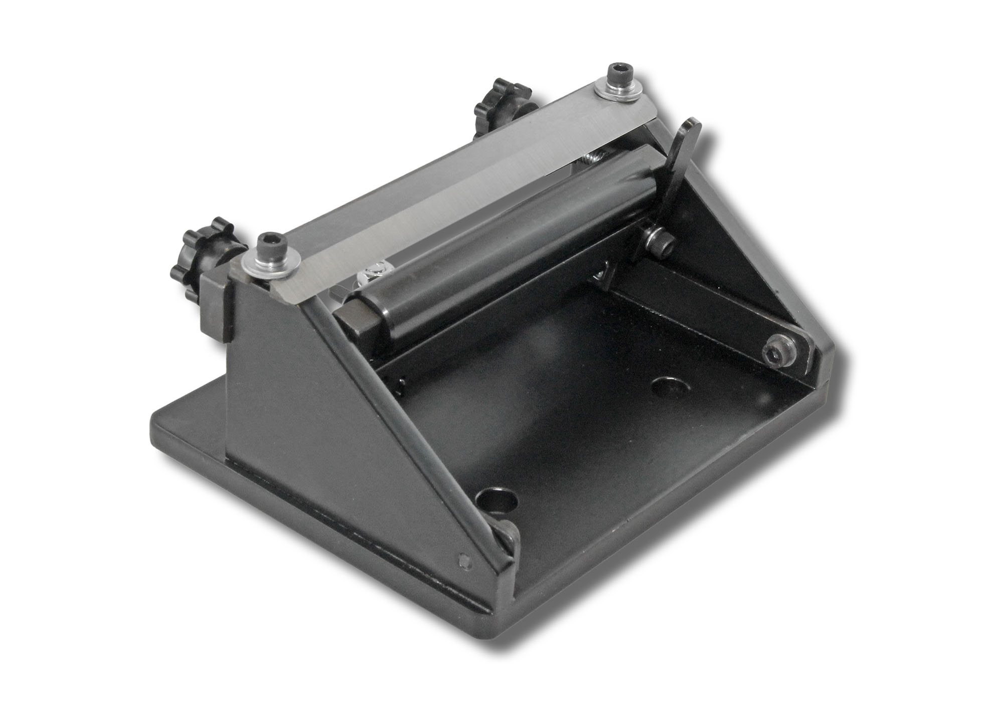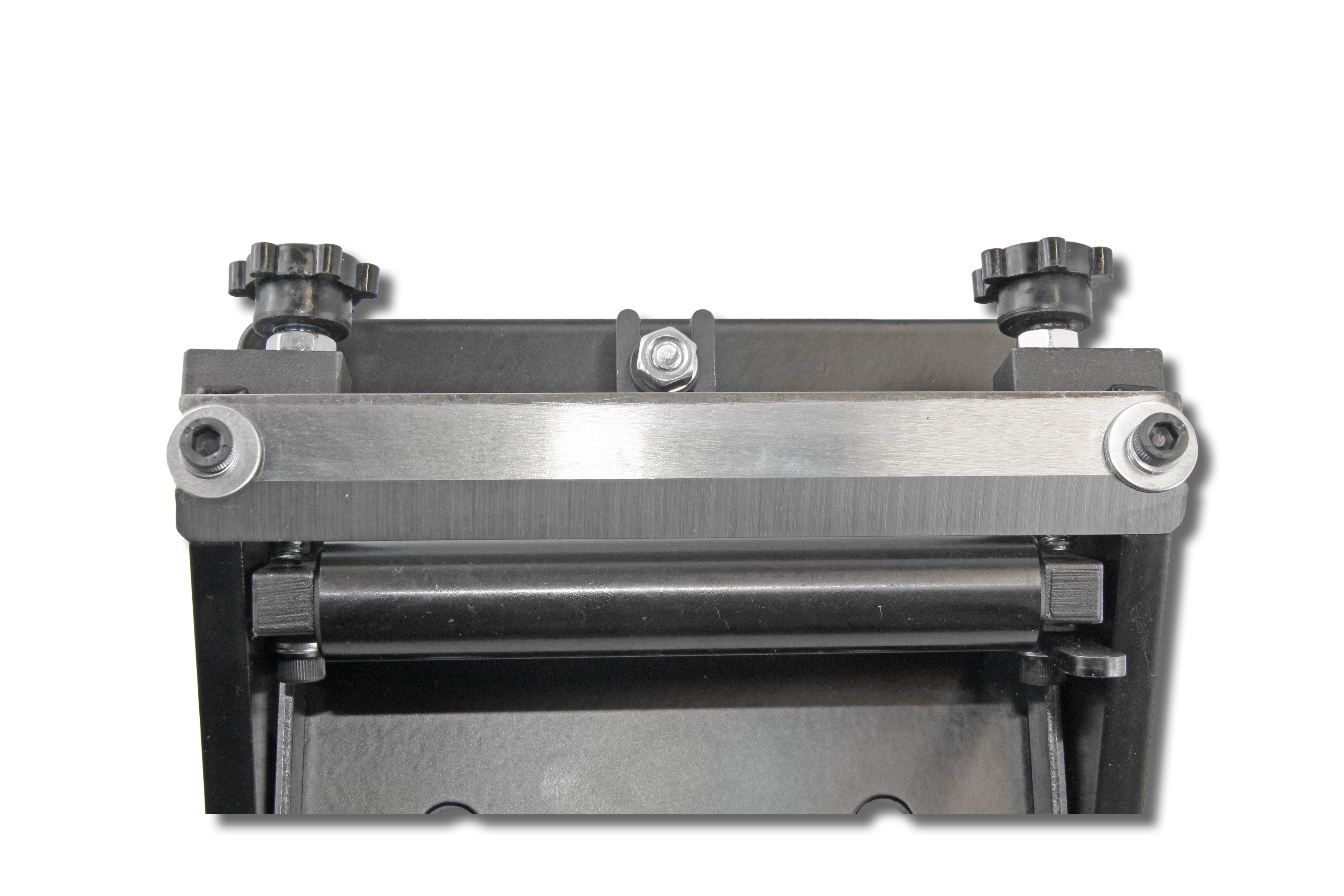 To ensure that the machine is secure, we recommend to affix it on your workbench with 2 screws (not included). The thickness to be split can be adjusted with the wing screws on the back. With the lower wing screw, the role is raised / lowered until your desired splitting thickness is reached.