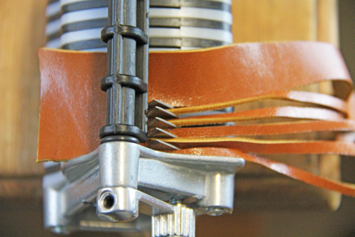 Solid and robust lace, fringe, belt and strap cutter for mounting on a table edge, cuts up to 4 mm thick leather into fine stripes. Including 2 different plastic inserts (variable stripe width) and 5 blades.