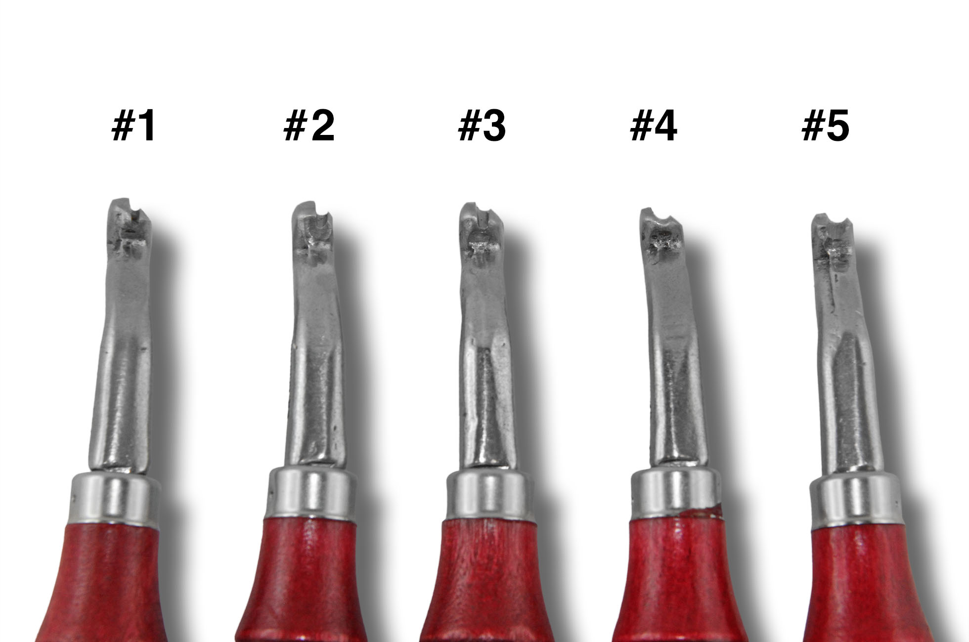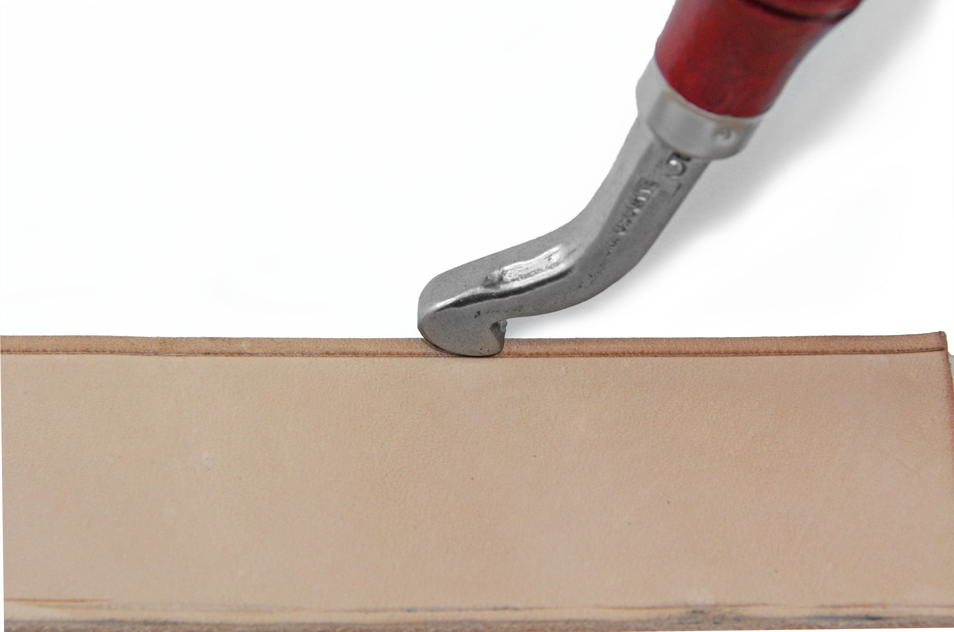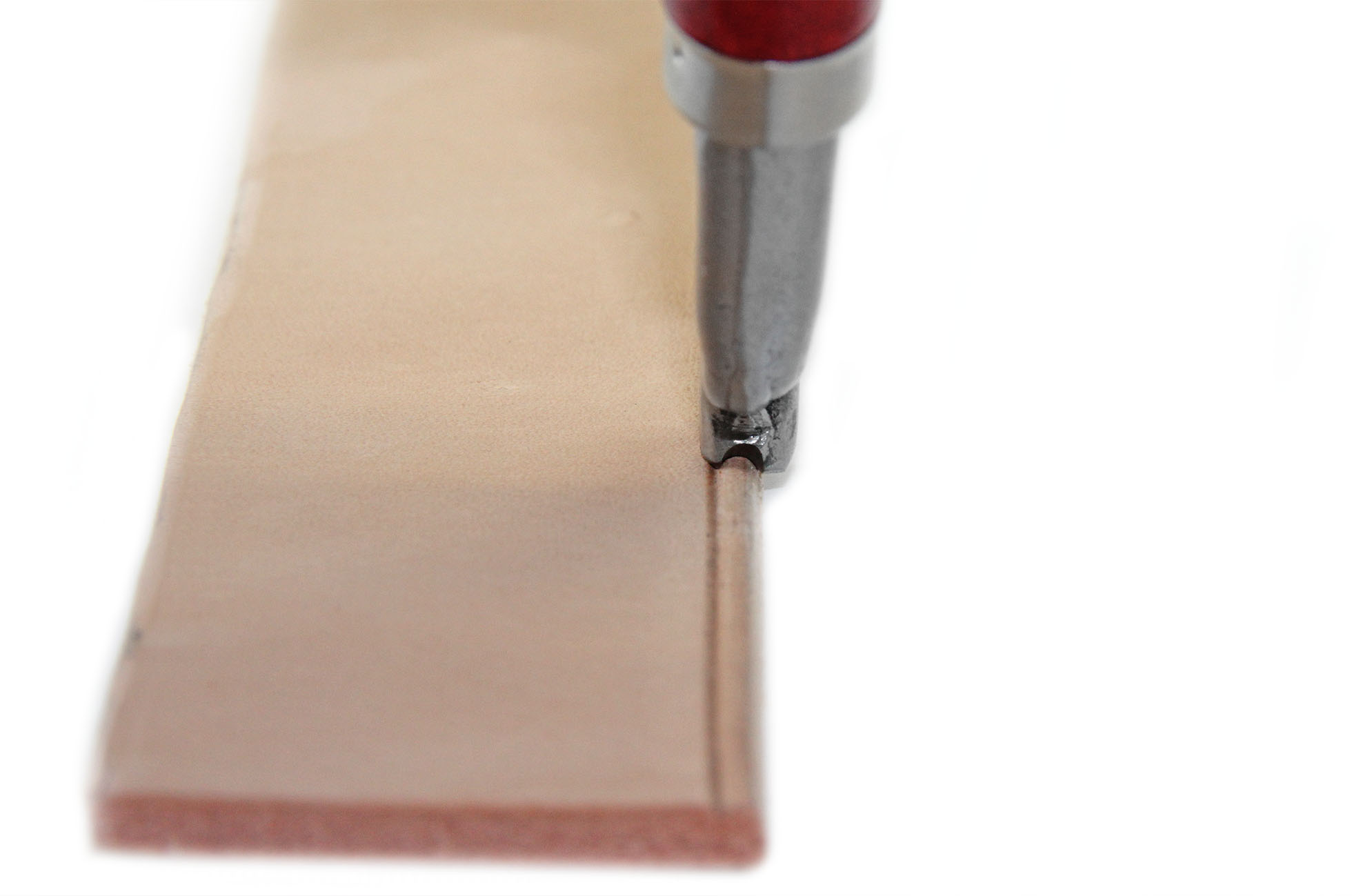 To create a decorative groove (crease) while rounding the edge of the leather. Available in 5 different sizes. The tools have a fixed stop whose distance reflects the respective tool size.