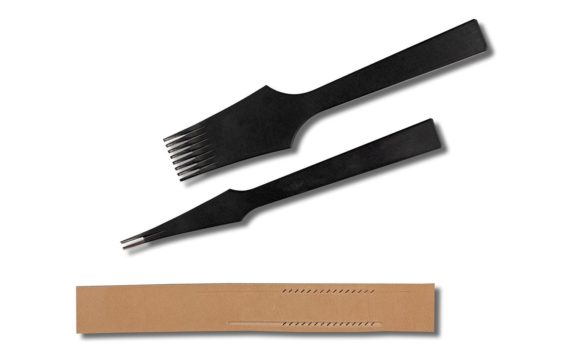 This type of multi tine iron is not used to pierce the leather completely, but merely to pre-mark the seam spacing similar to a seam marker. The slits created during light impacting, help to guide the awl through the leather and signify a uniform seam course. (Of course, the leather can also be completely punctured.)