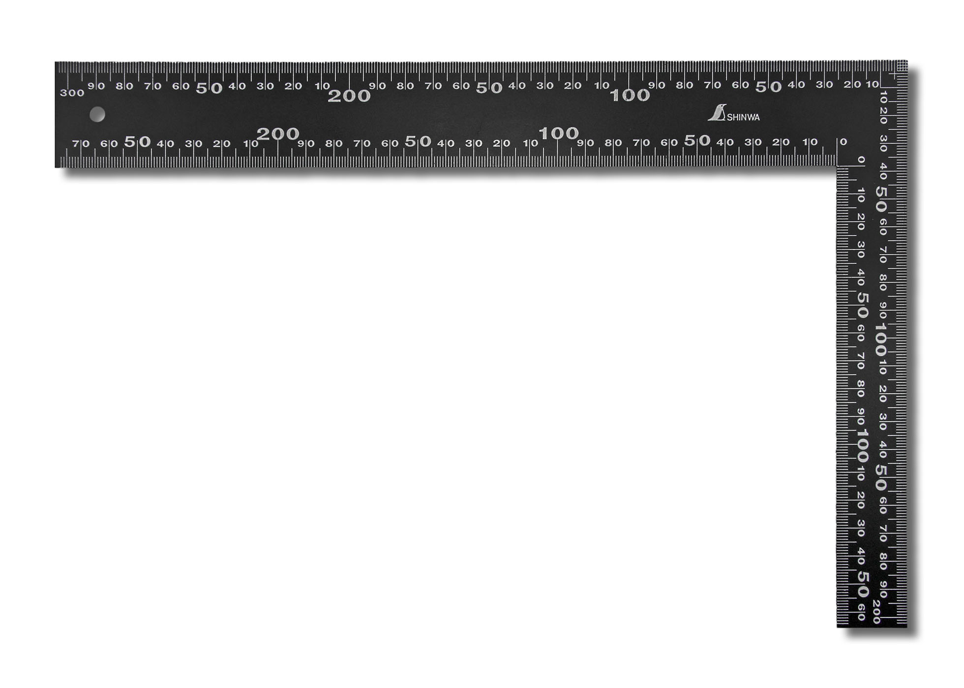 Square made from 1.5 mm, matt black painted steel for glare-free reading. The millimeter scale on all long edges is printed on both sides of the square.