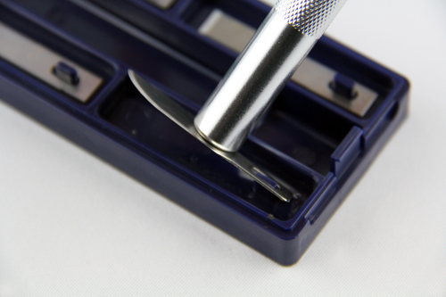 Including 6 different blades. The back of the scalpel is magnetic, so the blades can be easily removed from the plastic box.