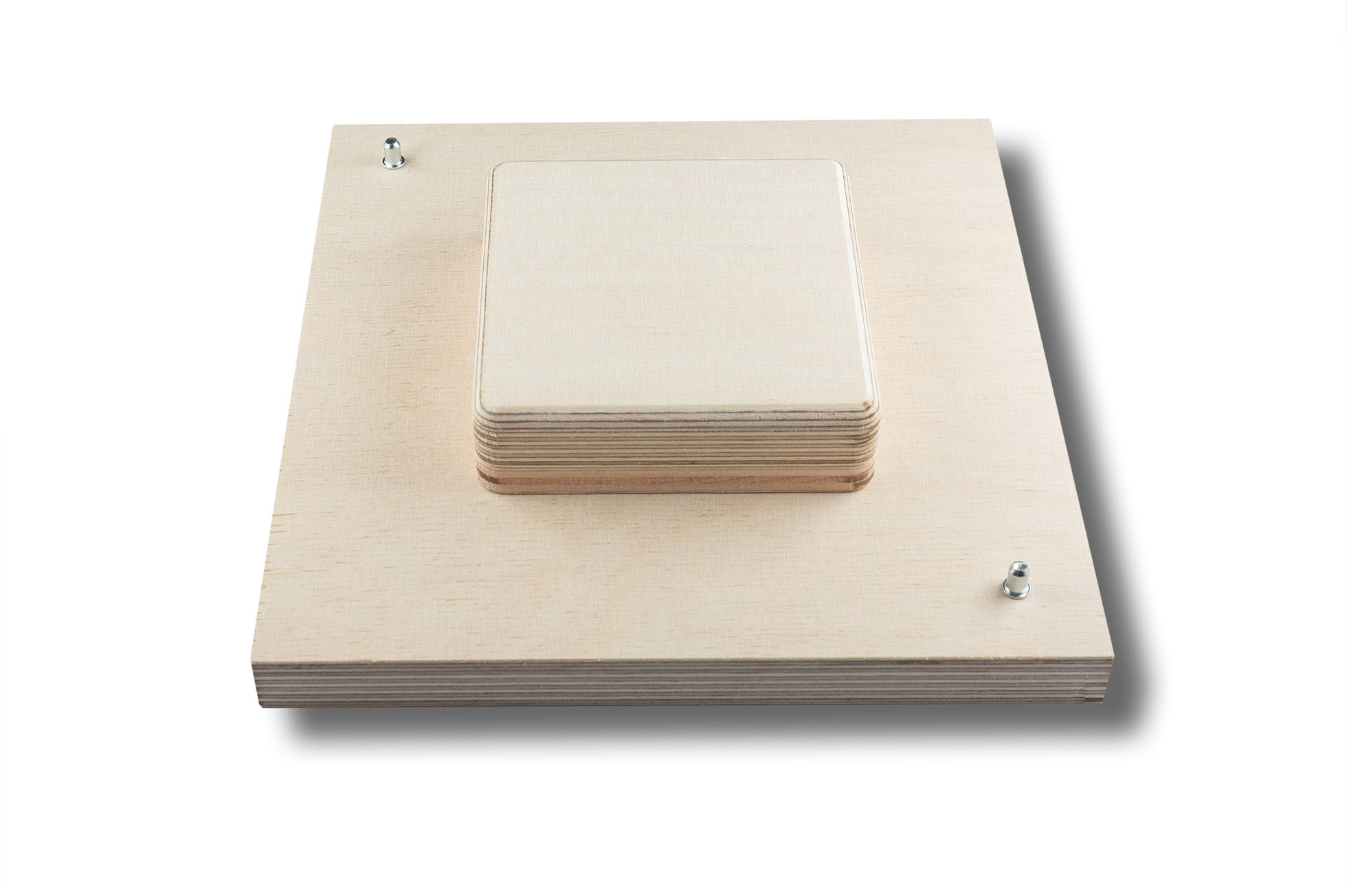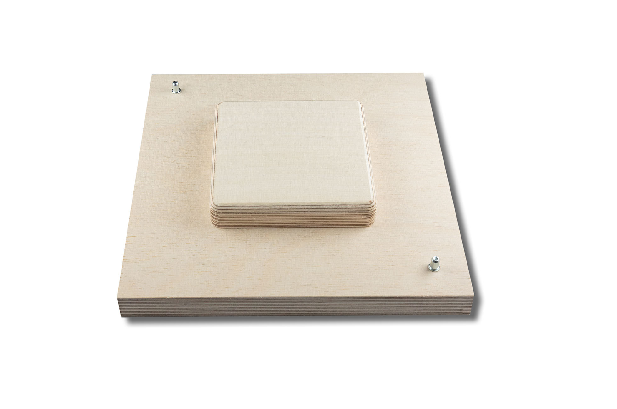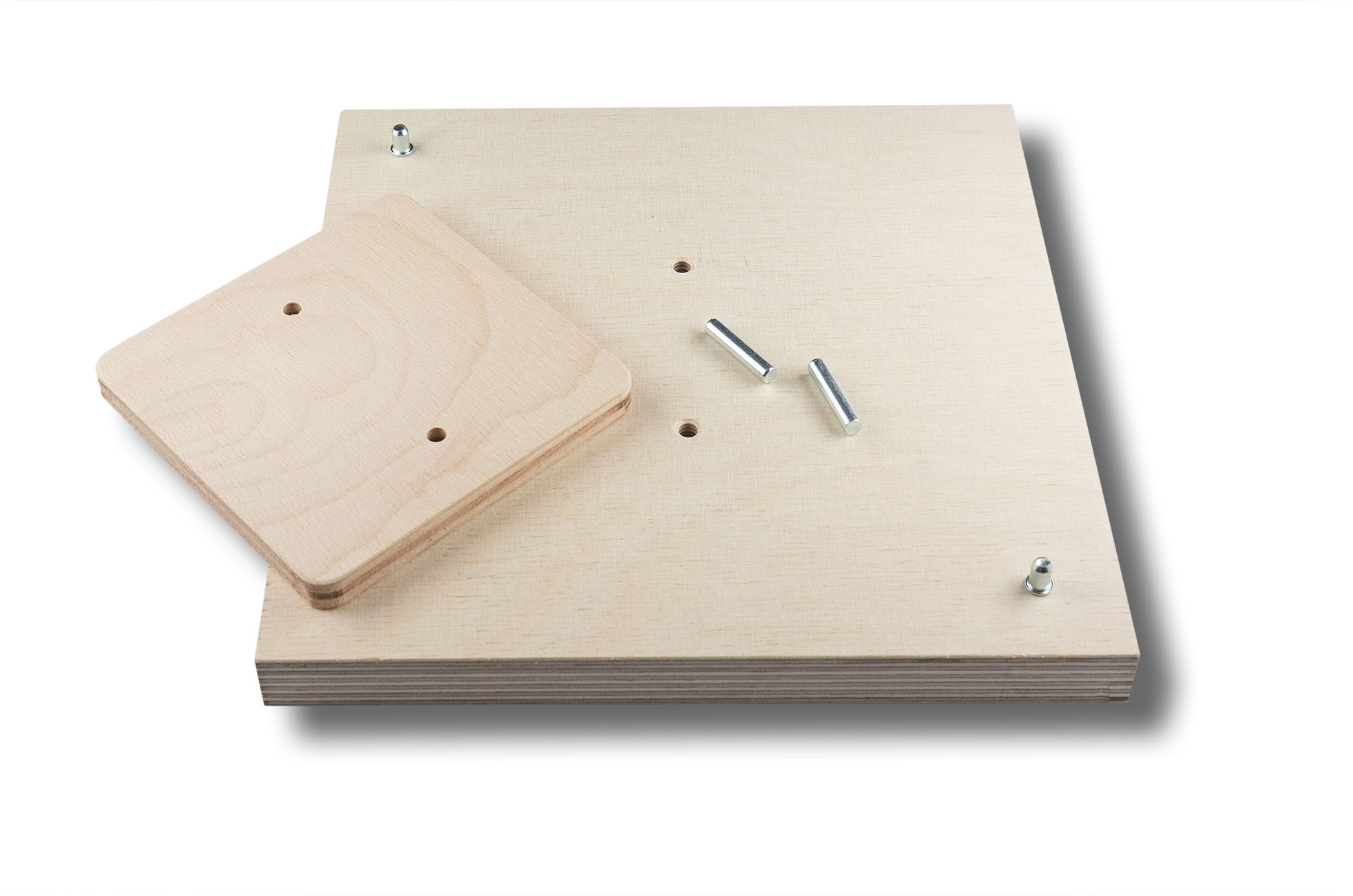 Material: 18 mm plywood for base, frame and inlay, 10 mm plywood spacer as sandwich for increased height. Pins for positioning included.