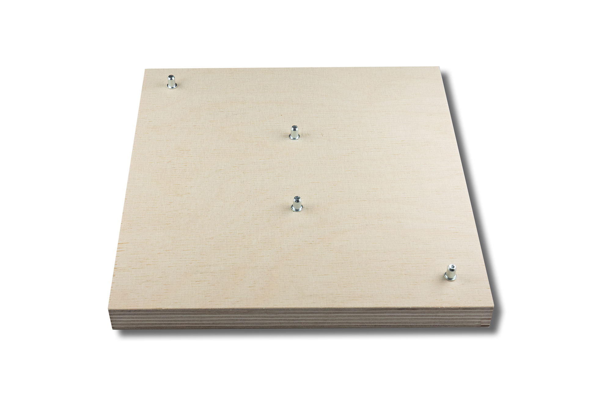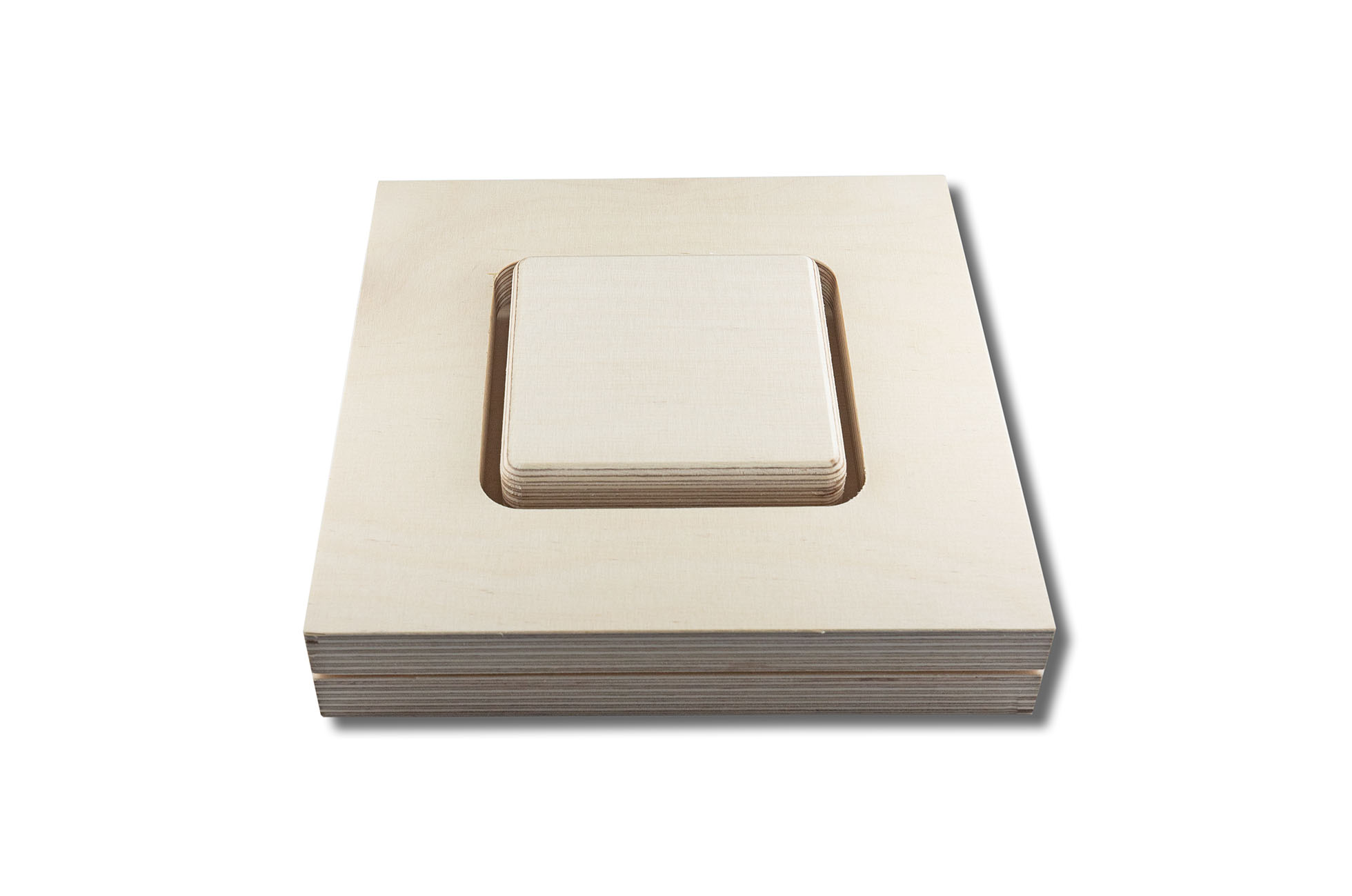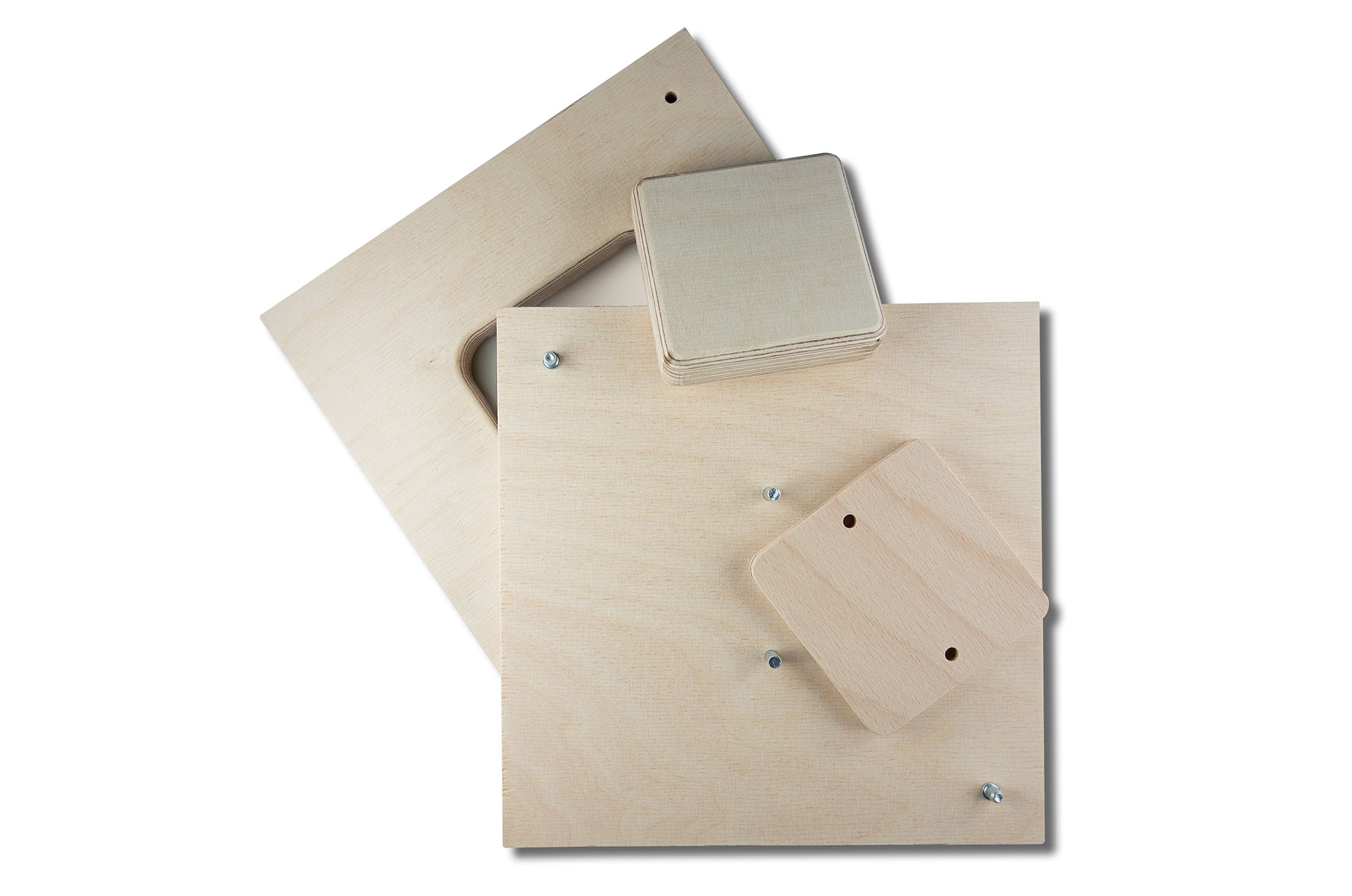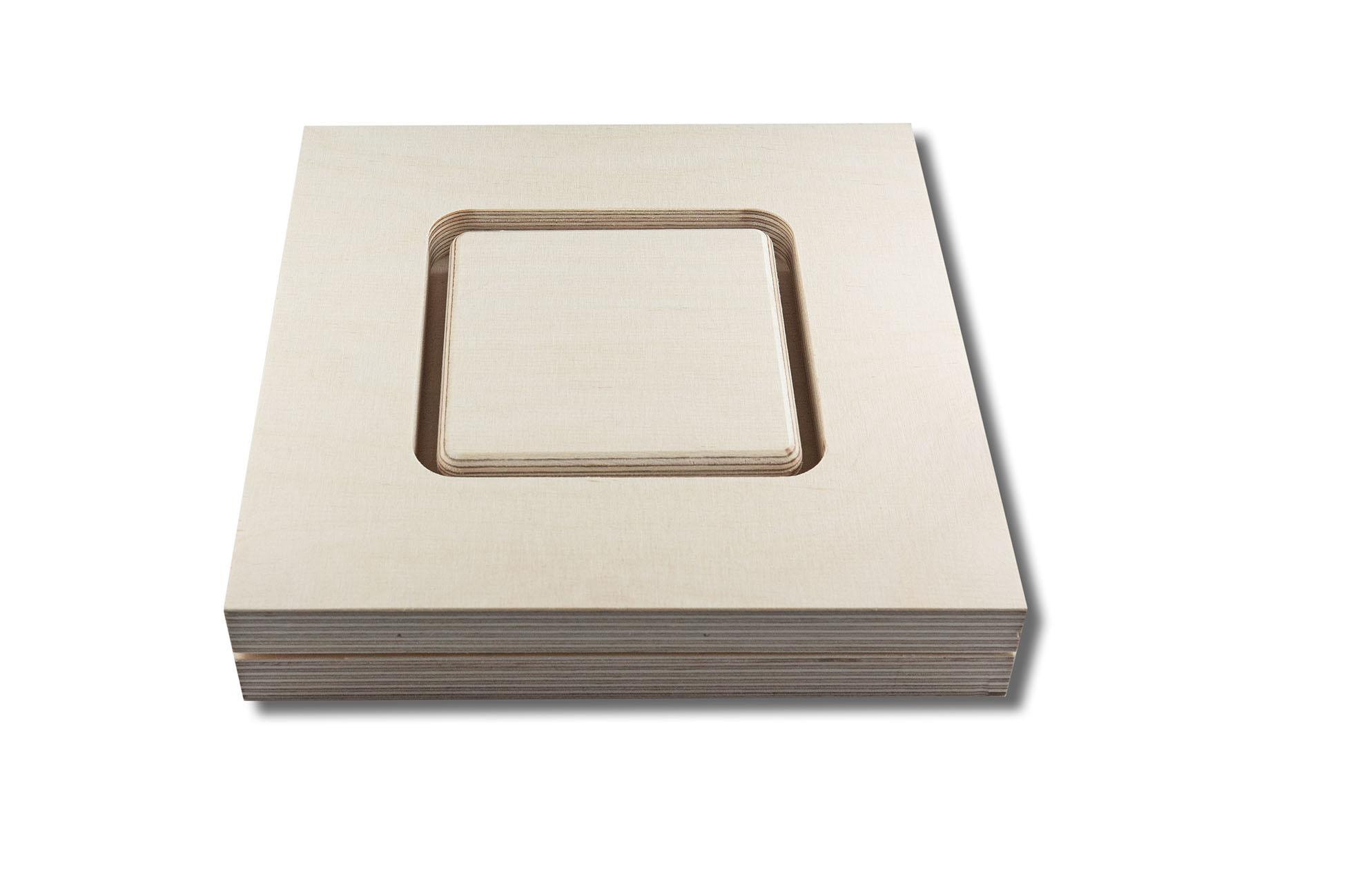 Material: 18 mm plywood for base, frame and inlay, 10 mm plywood spacer as sandwich for increased height. Pins for positioning included.